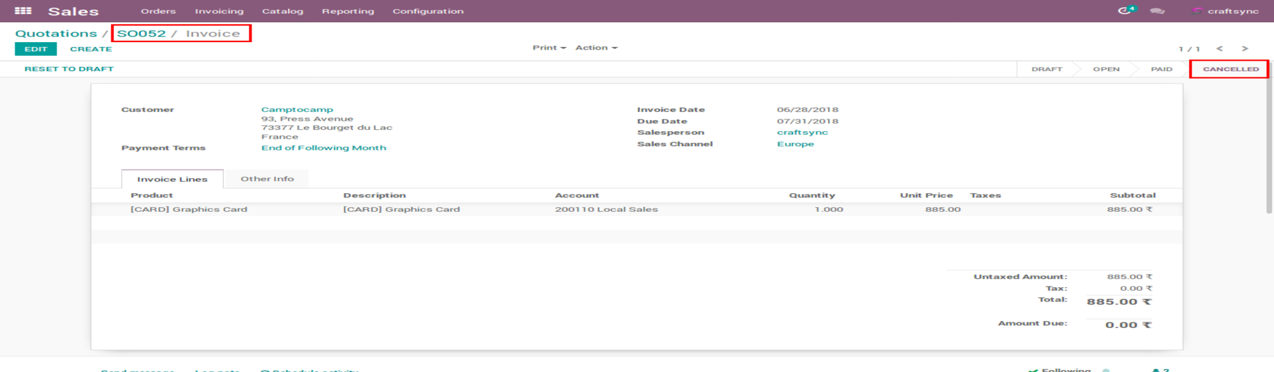 After cancelling invoice/bill, You can see the invoice is in 'Cancelled' state.