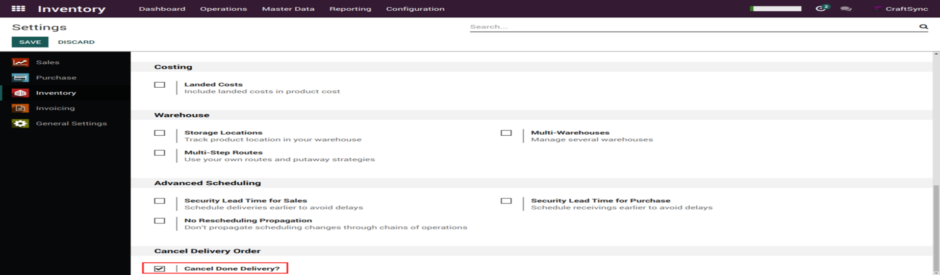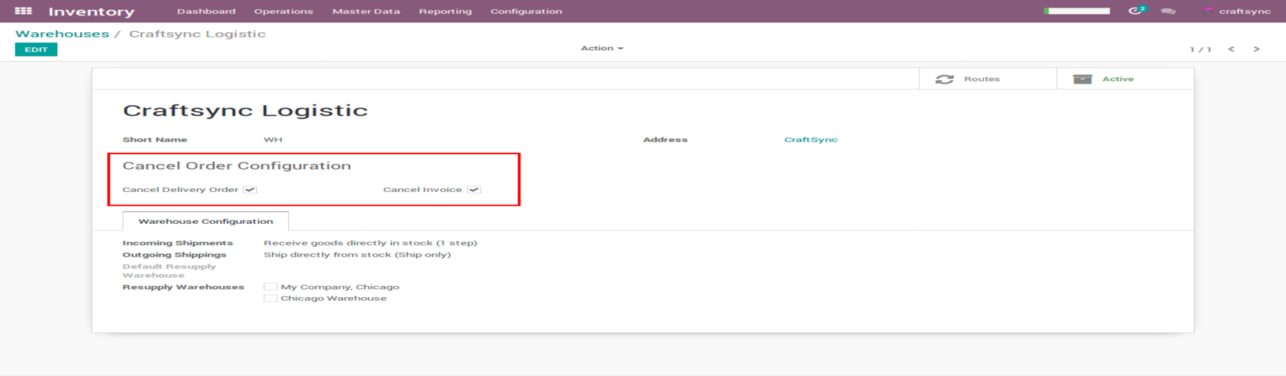 Cancel Sale Order configuration will appear in Invetory --> Warehouse form.