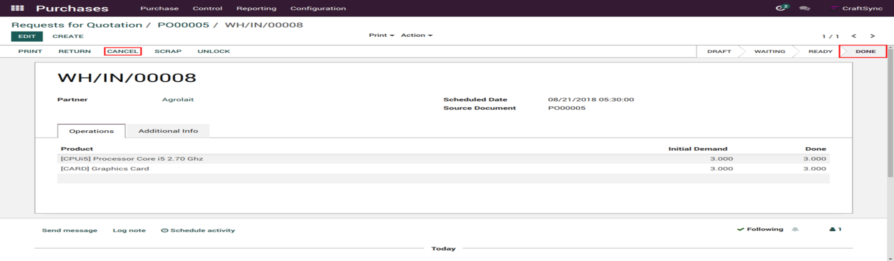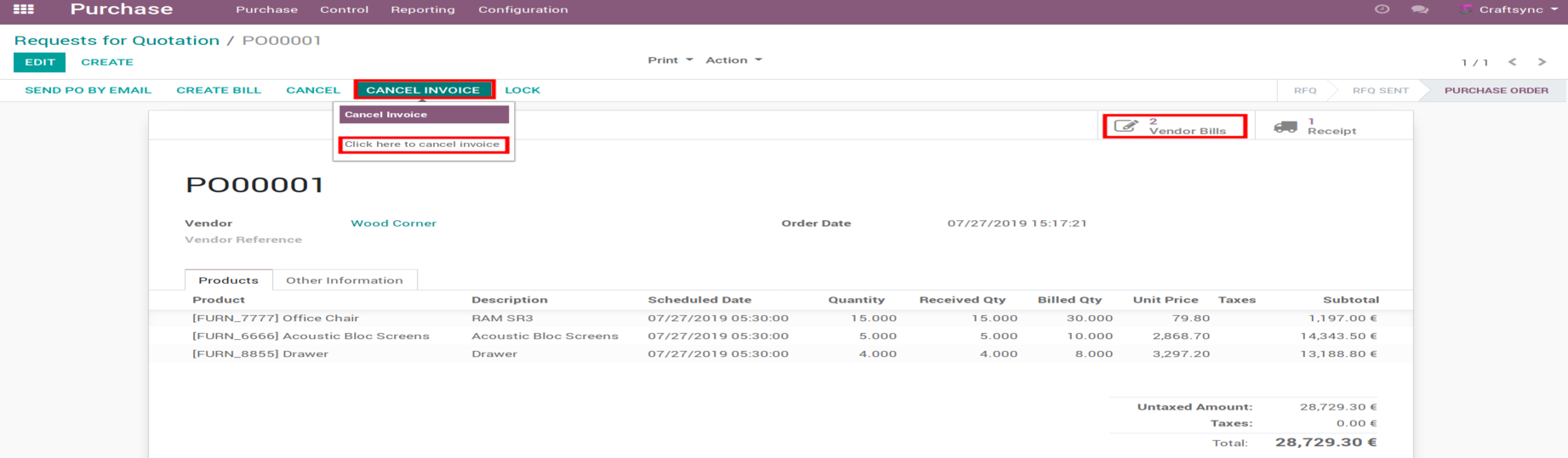 Following image shows purchase order after clicking on cancel button, After cancelling purchase order,You can see the order is in 'Cancelled' state and reset to draft button will be appear.