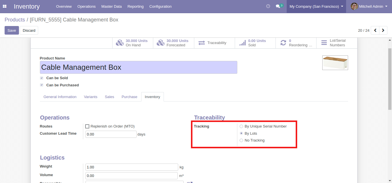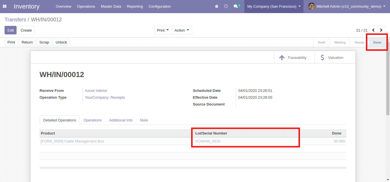 - Lot Number is automatically generated based on Lot code provided in Operation Type configuration.