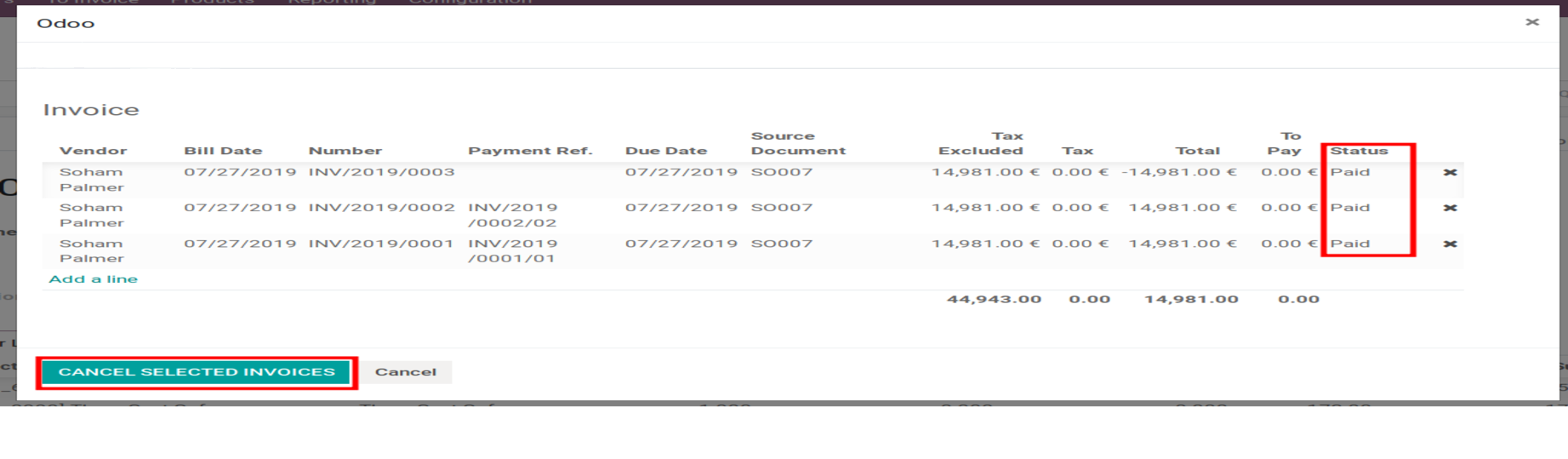User can also cancel multiple invoice from Cancel Invoice button and User can cancel invoice of purchase order even if it paid.