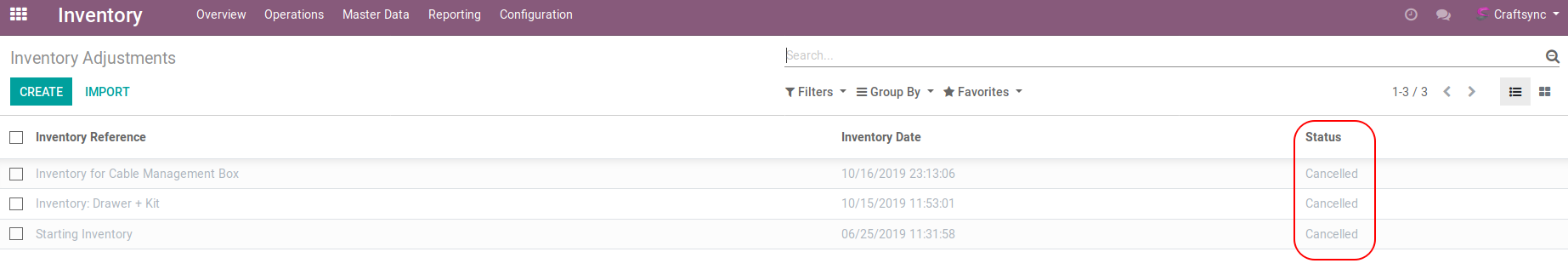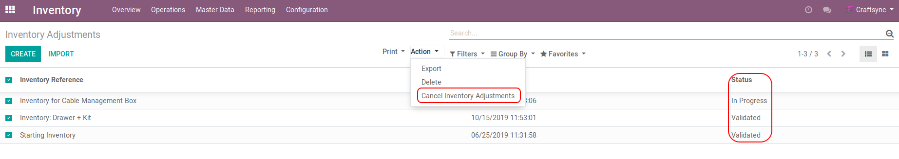 Following image shows in list view of Inventory Adjustment User can select more than one order for cancellation: