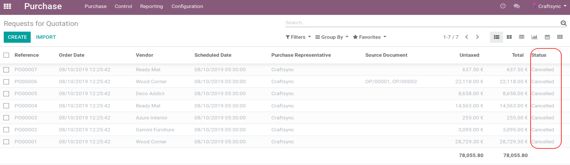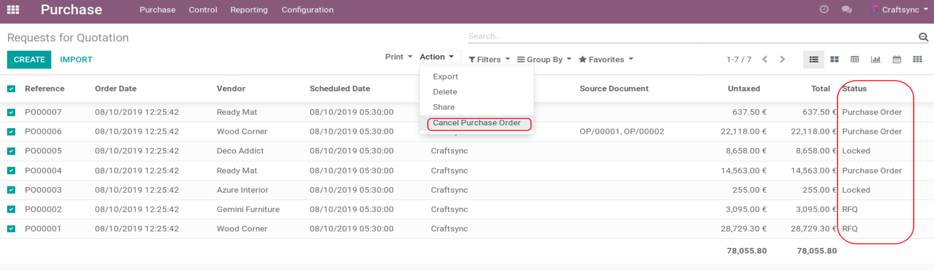 Following image shows in list view of purchase order User can select more than one order for cancellation: