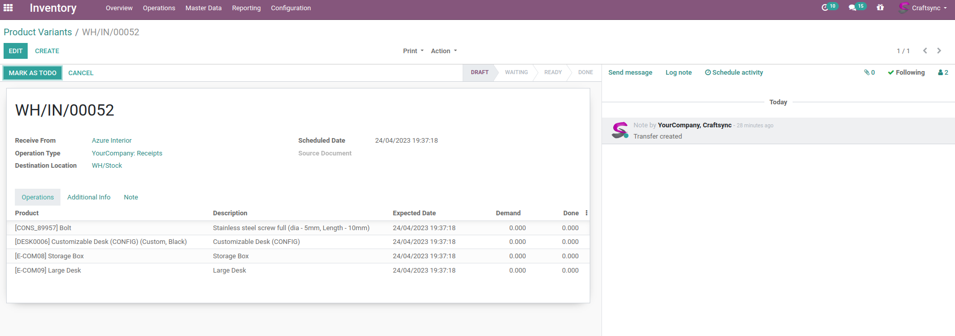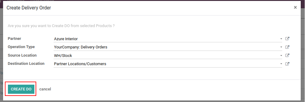 When user click on create delivery order action below popup will display. User can select Partner, operation type & locations of the order .