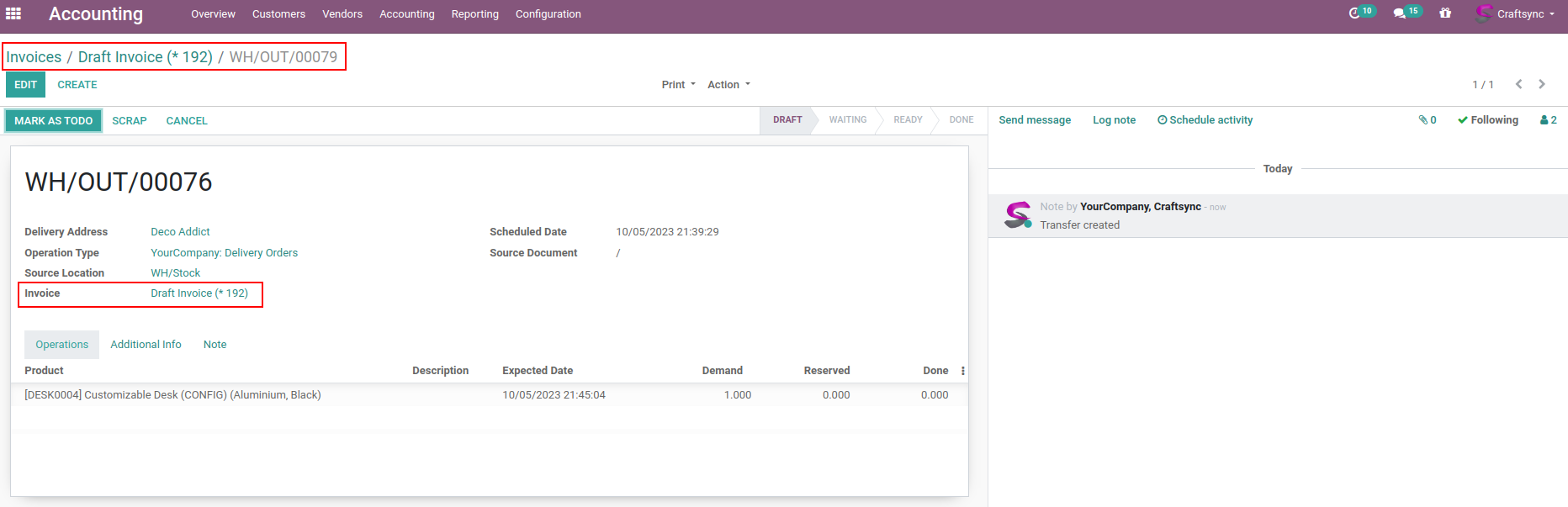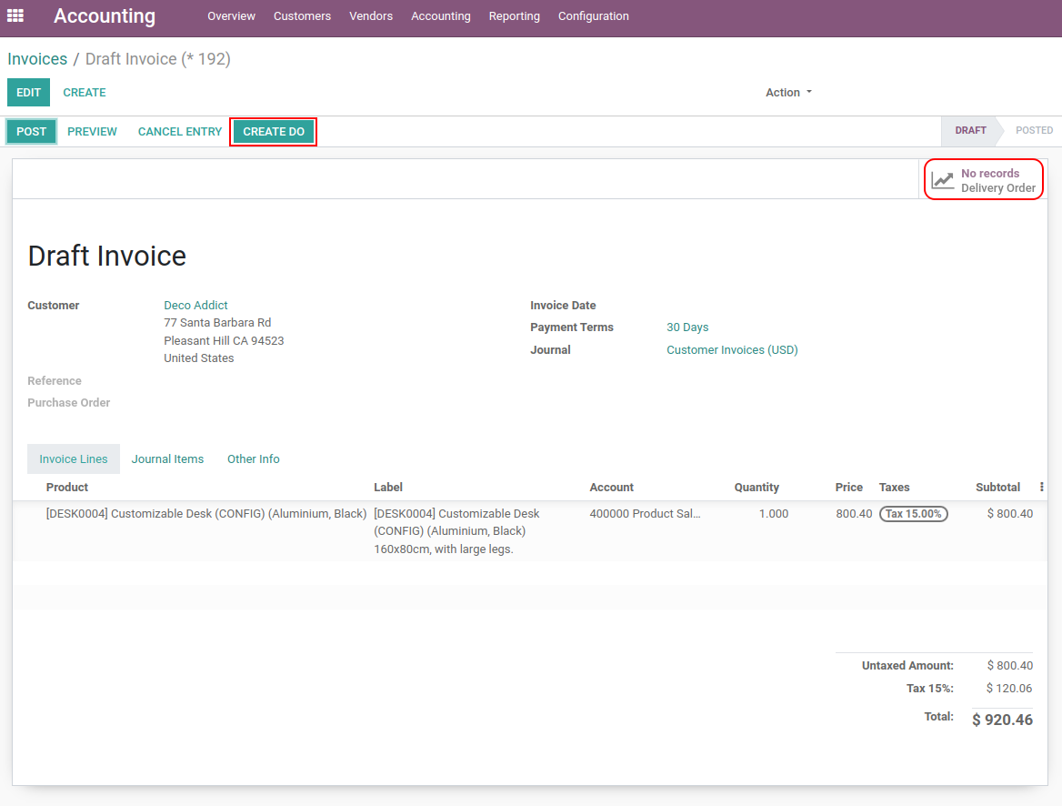 After click on Create DO button detail view of invoice will be shown below. Delivery order smart button for recently created will is automatically set.
