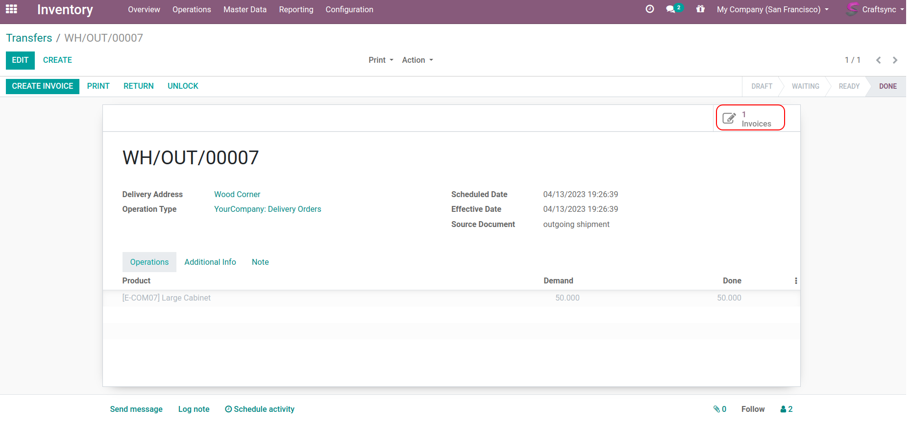 Detail view of Delivery order. Smart button of related invoice.