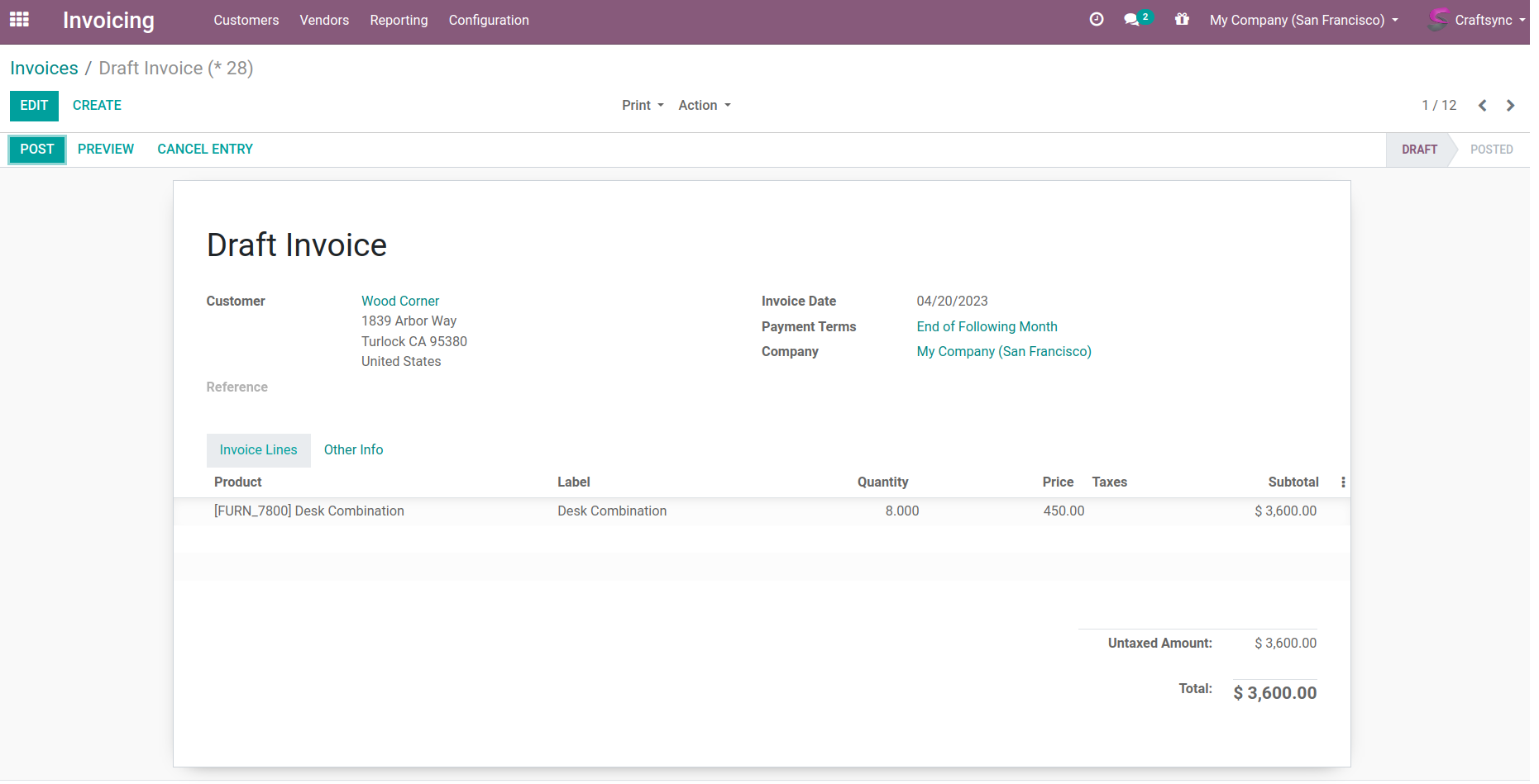 Detail view recently created invoice.