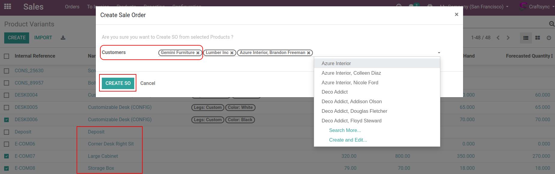 When user click on create sale order action below popup will display. User can select multiple customer for orders.