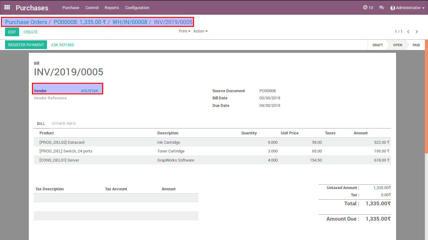 - Based On Configuraton Vendor Bill can Create in Open state.