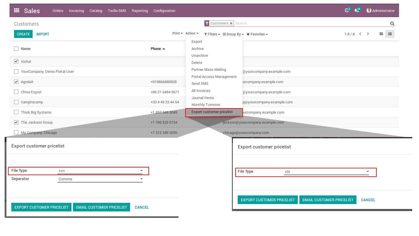 - Select the customers >> click on Print >> Click "Export pricelist as Customer".
