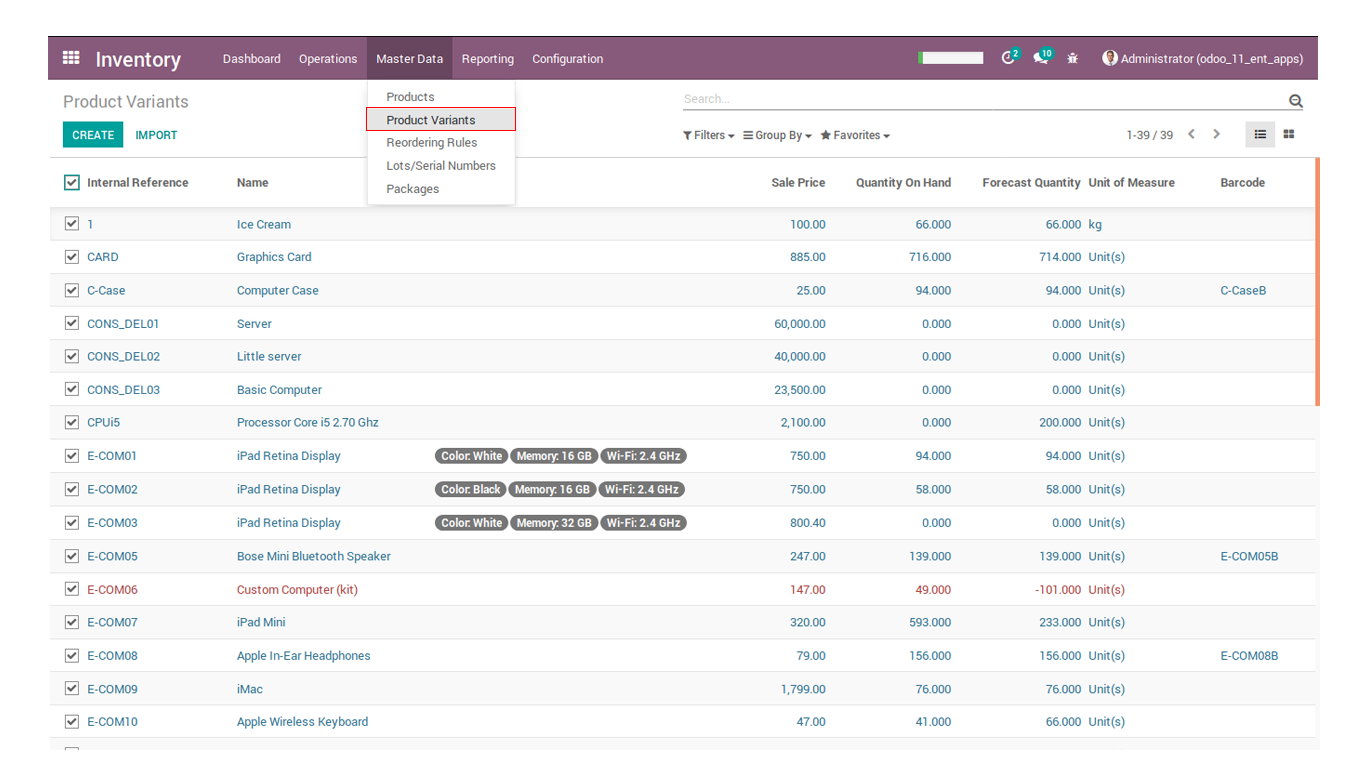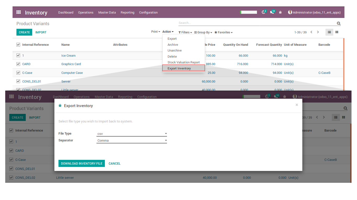 • Supported with less data like you can import inventory with only product name, barcode or Internal Reference (Default code) within same file.