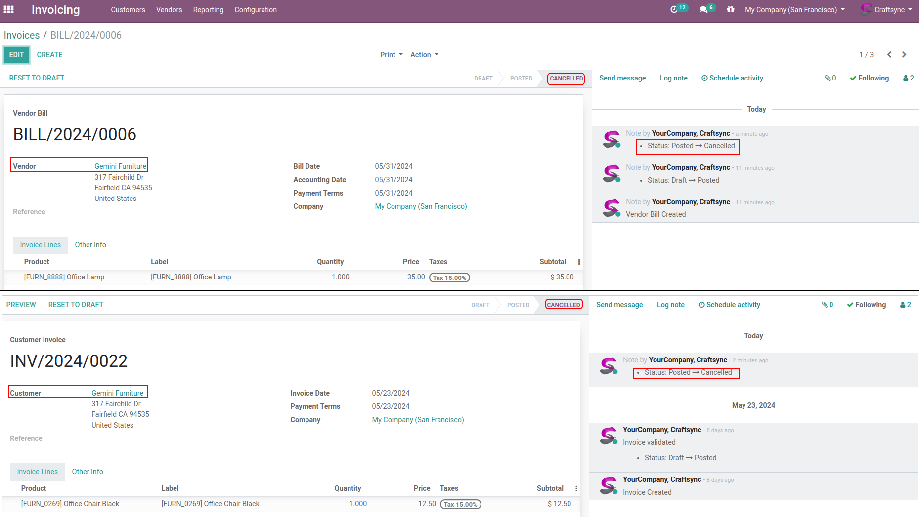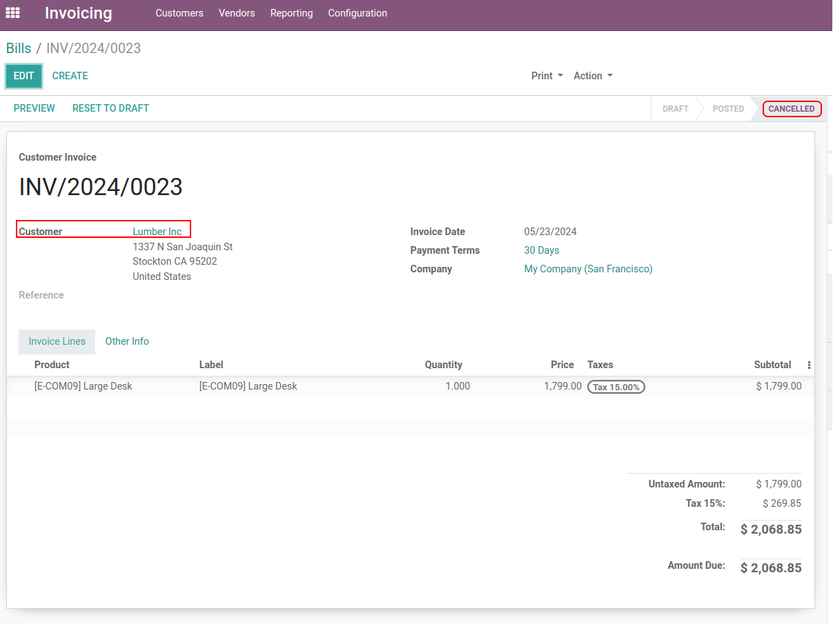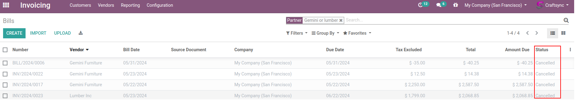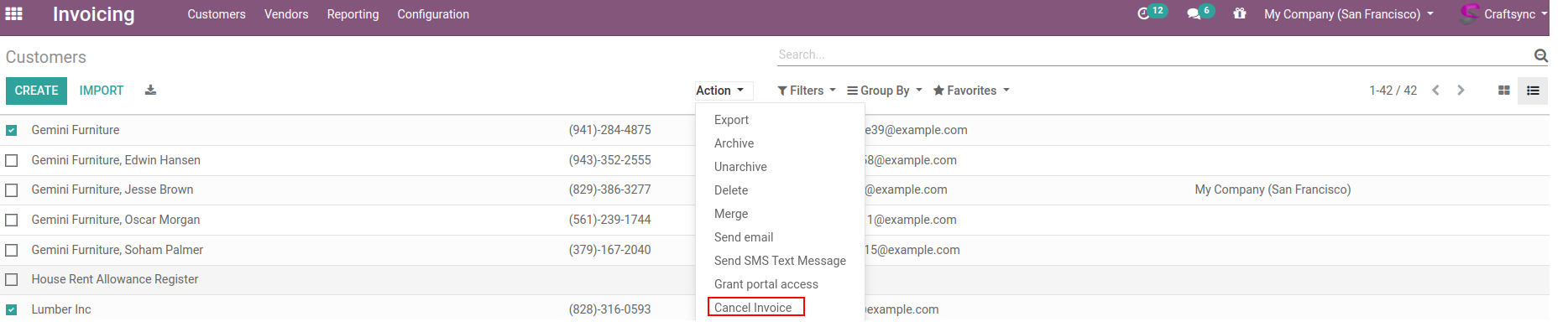 After clicking cancel Invoice action All Invoices are now in Cancelled state.