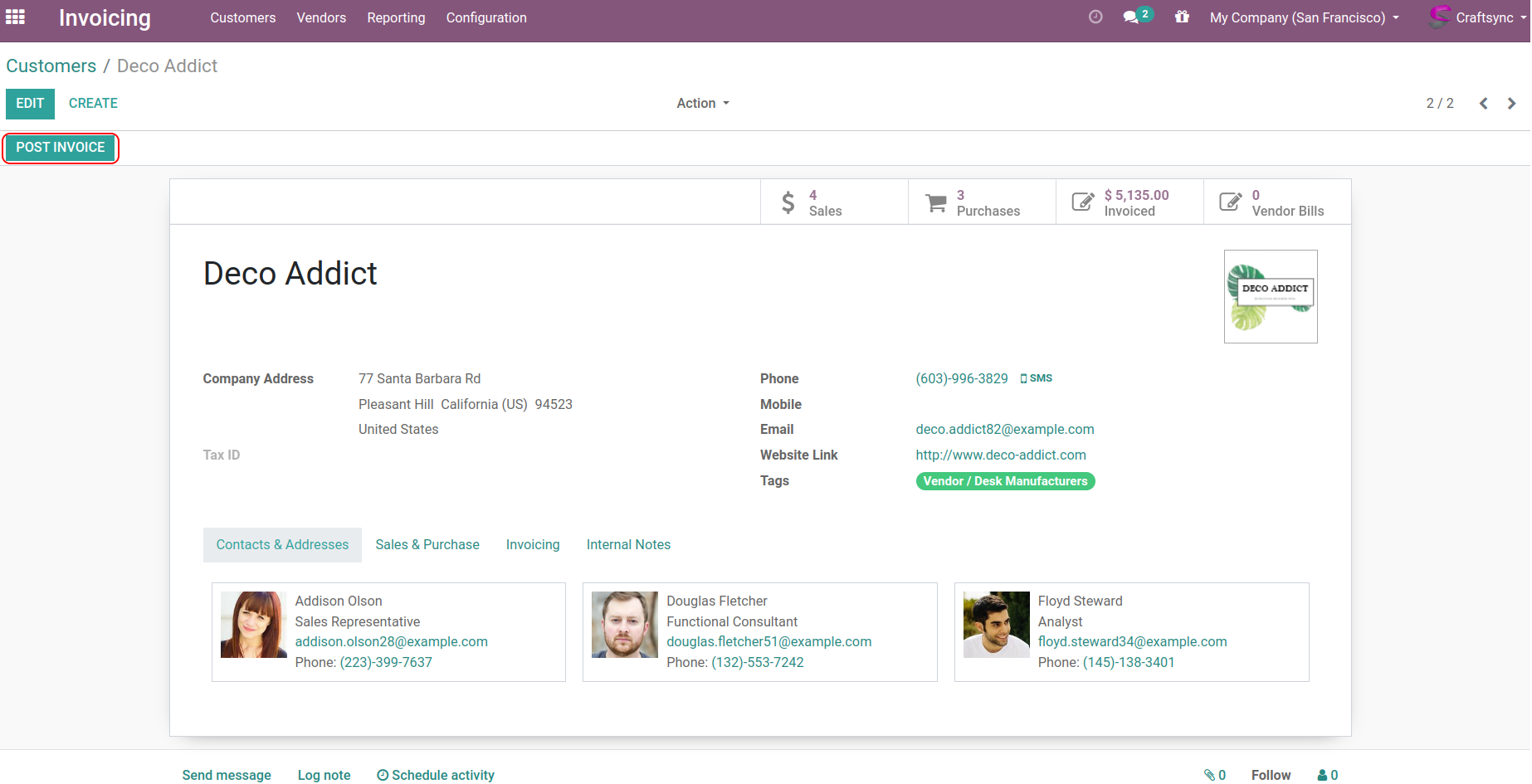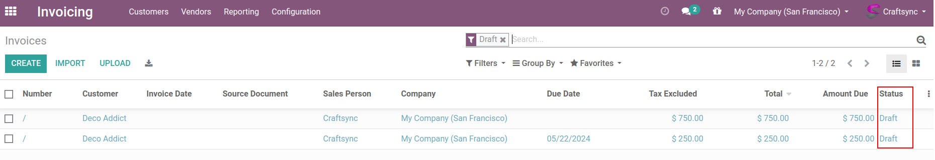 Here are Bill list view, having Two Invoice are in Draft state of partner name Deco Addict.