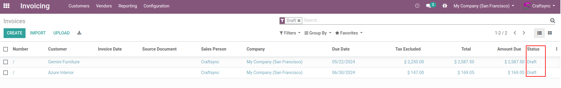 Here are invoice list view, having Two invoice are in Draft state.