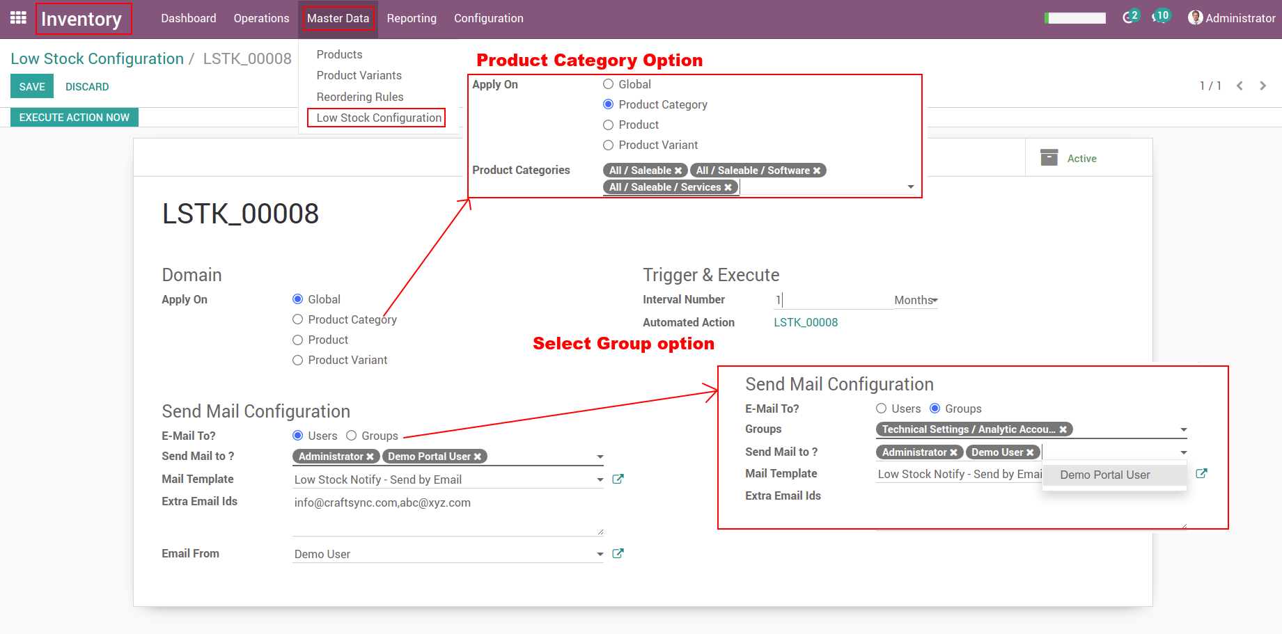 User Can configure based on requirements. Global product's , product Categories. Suppose user select Category option related product's stock will check. Based on selected configuration user will receive the email of low stock.