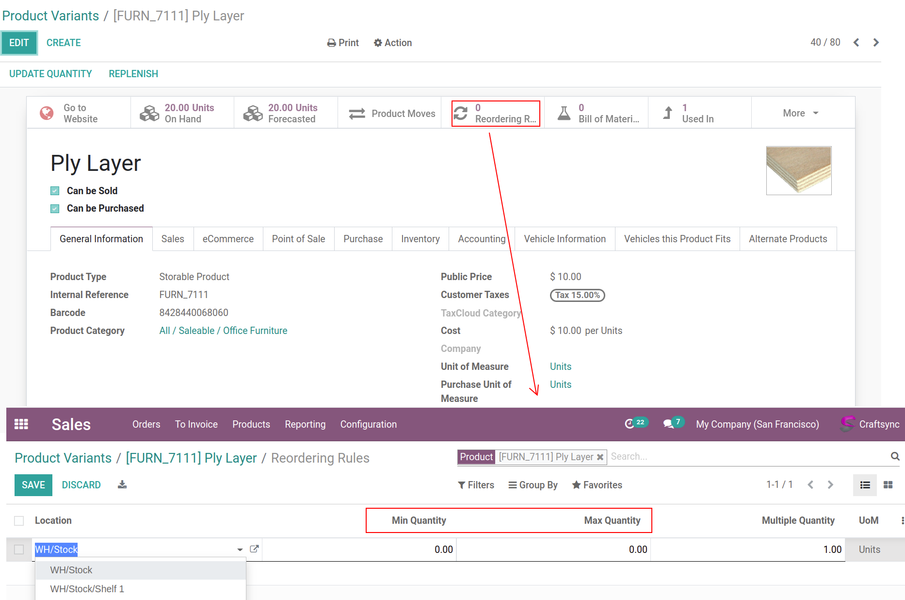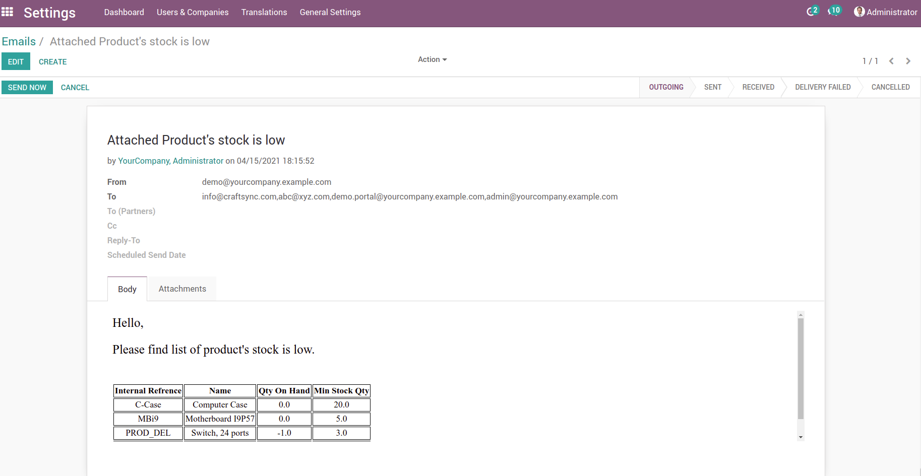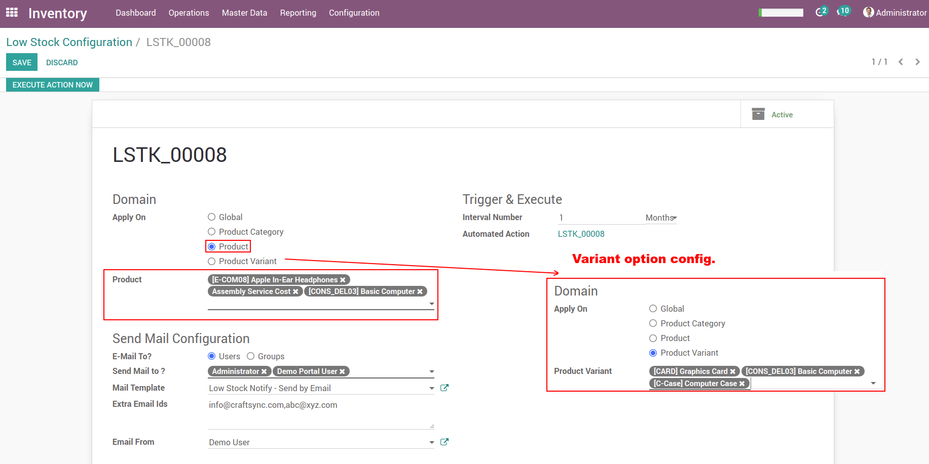 Suppose user select Product Template option related So that that templates Variant's on hand qty is below minmum reording qty then email will send with this product.