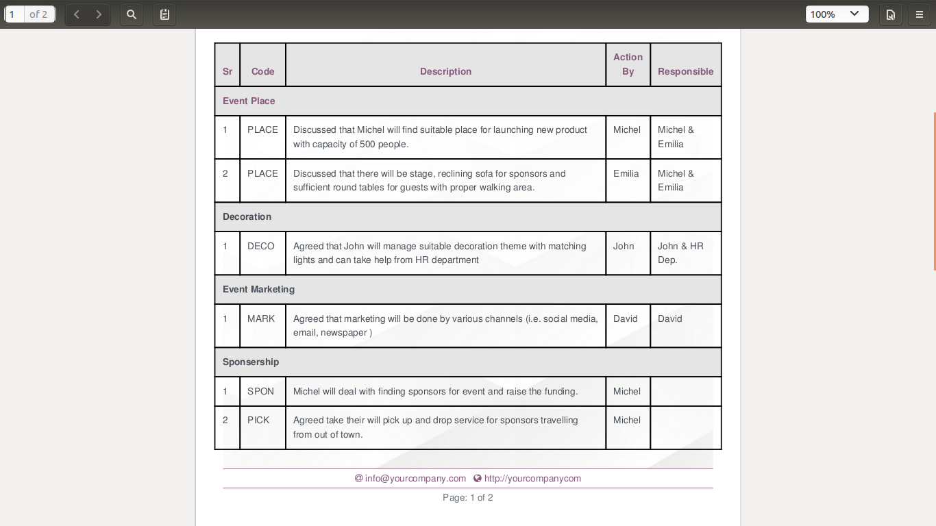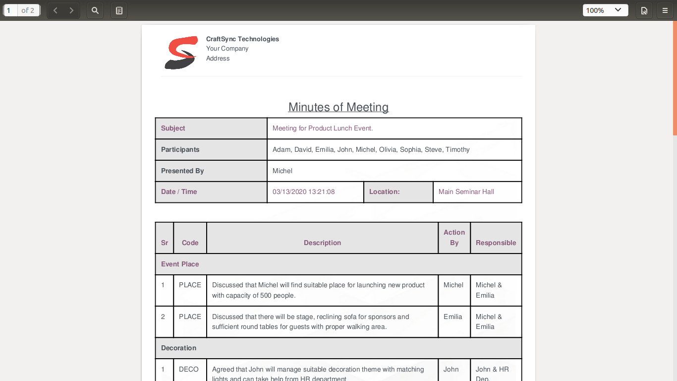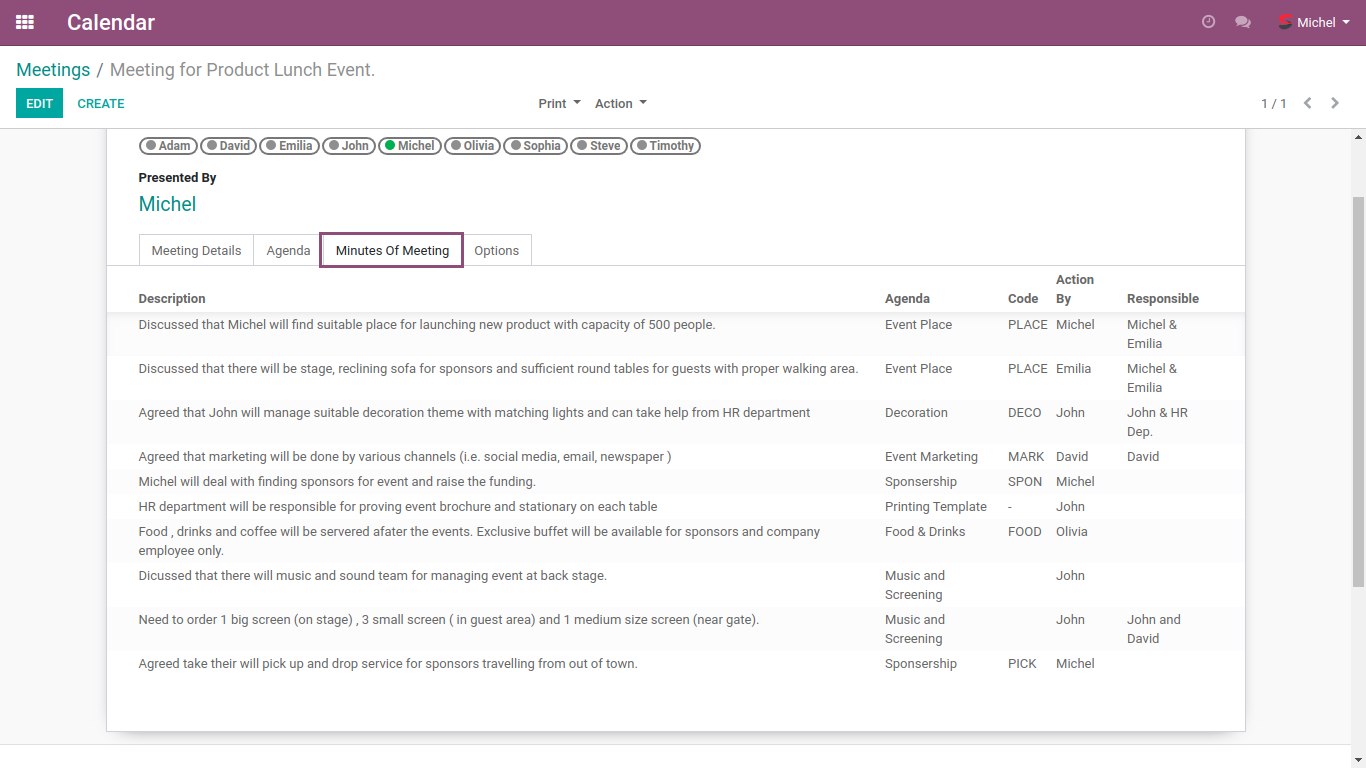 • To add mom with details like related Agenda, Code if any , Action By and ability to add Responsible.