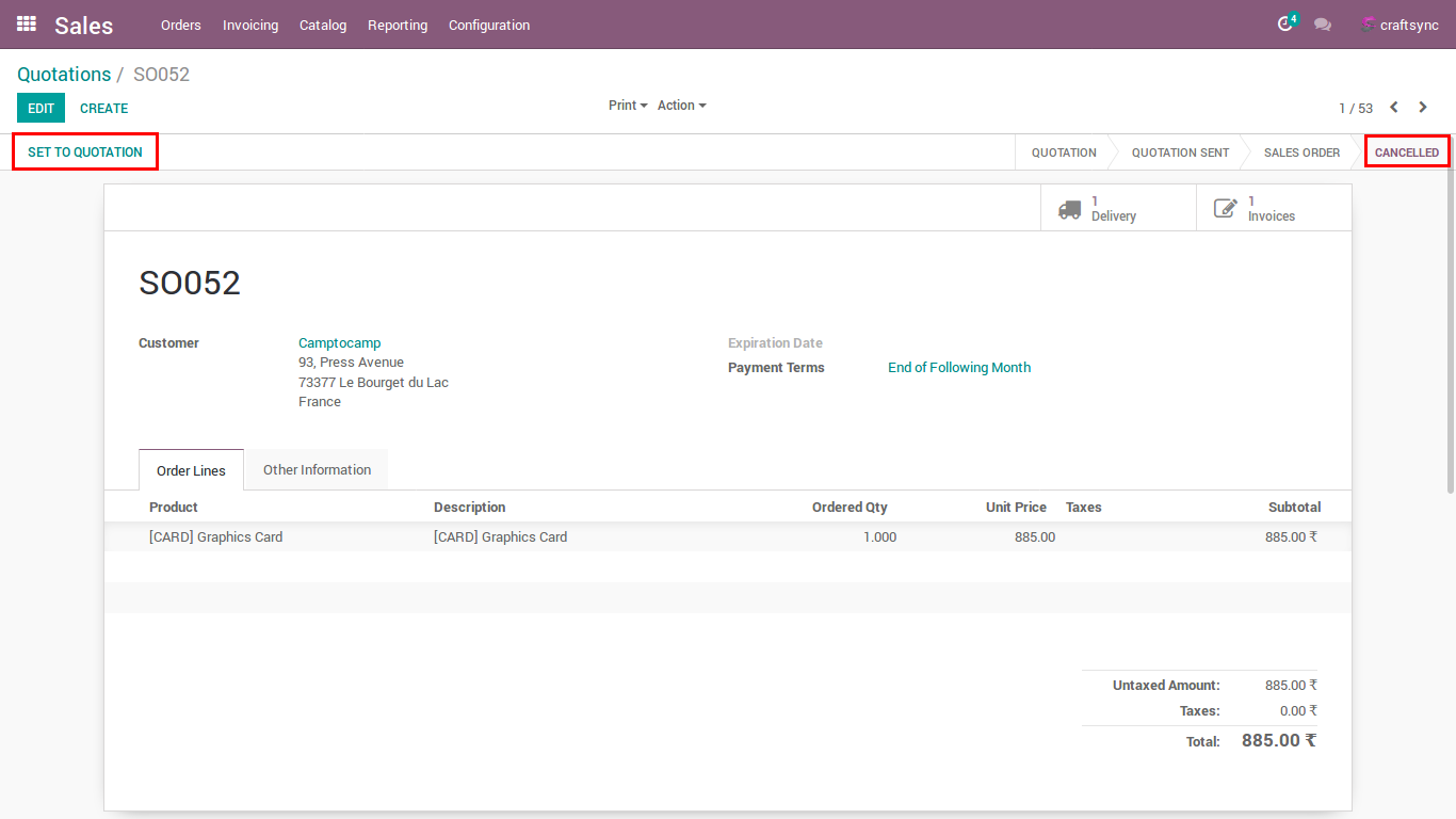 After cancelling sale order,You can see the order is in 'Cancelled' state and reset to draft button will be appear.