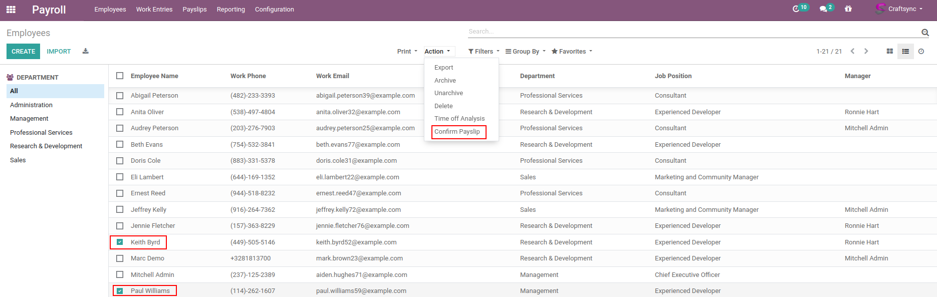 Detail view of Payslips. After clicking Confirm Payslips Action view.