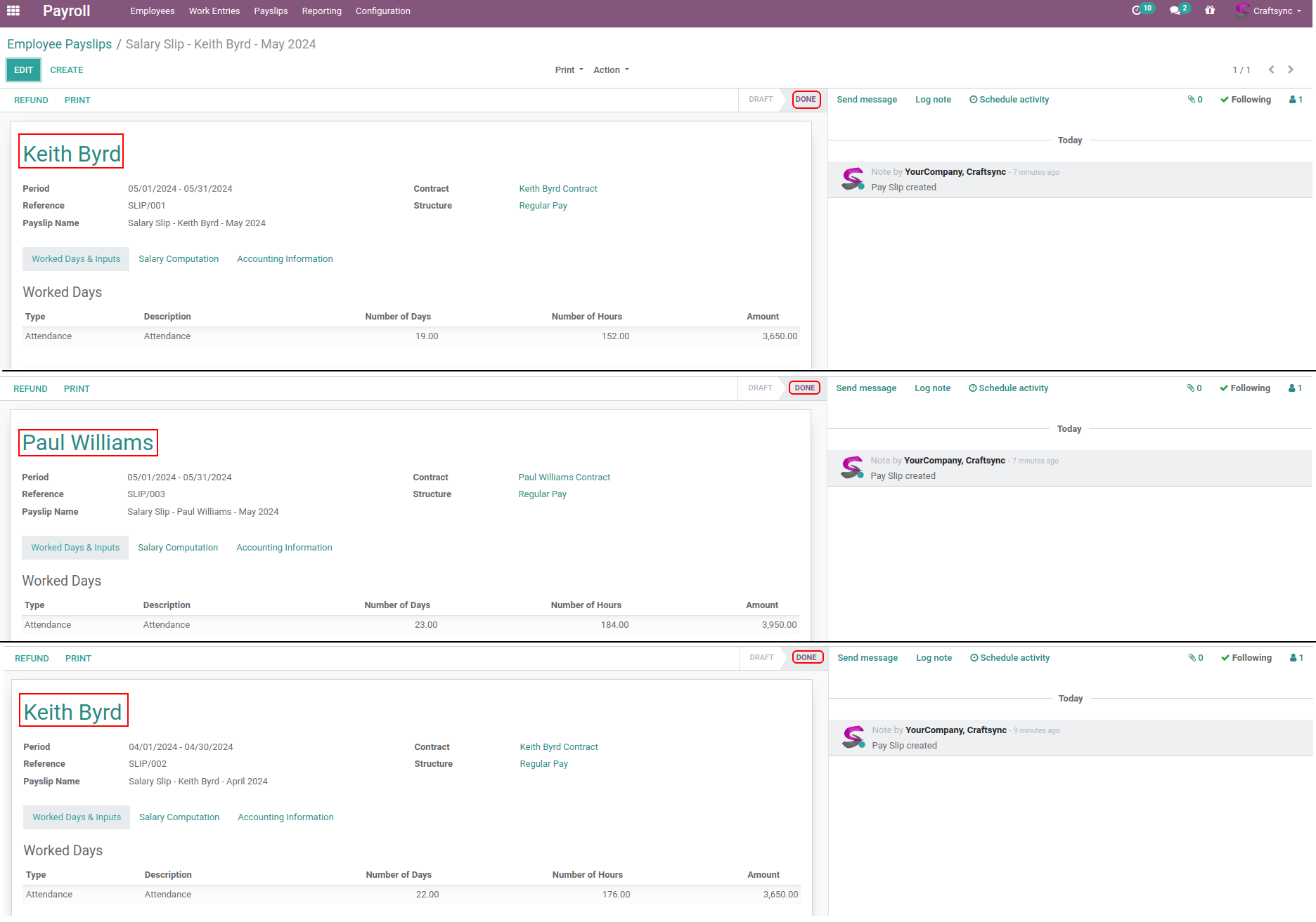 Here are Payslips whoes having Keith Byrd & Paul Williams as a Employees, Payslips list view having three Payslips are in Waiting state.