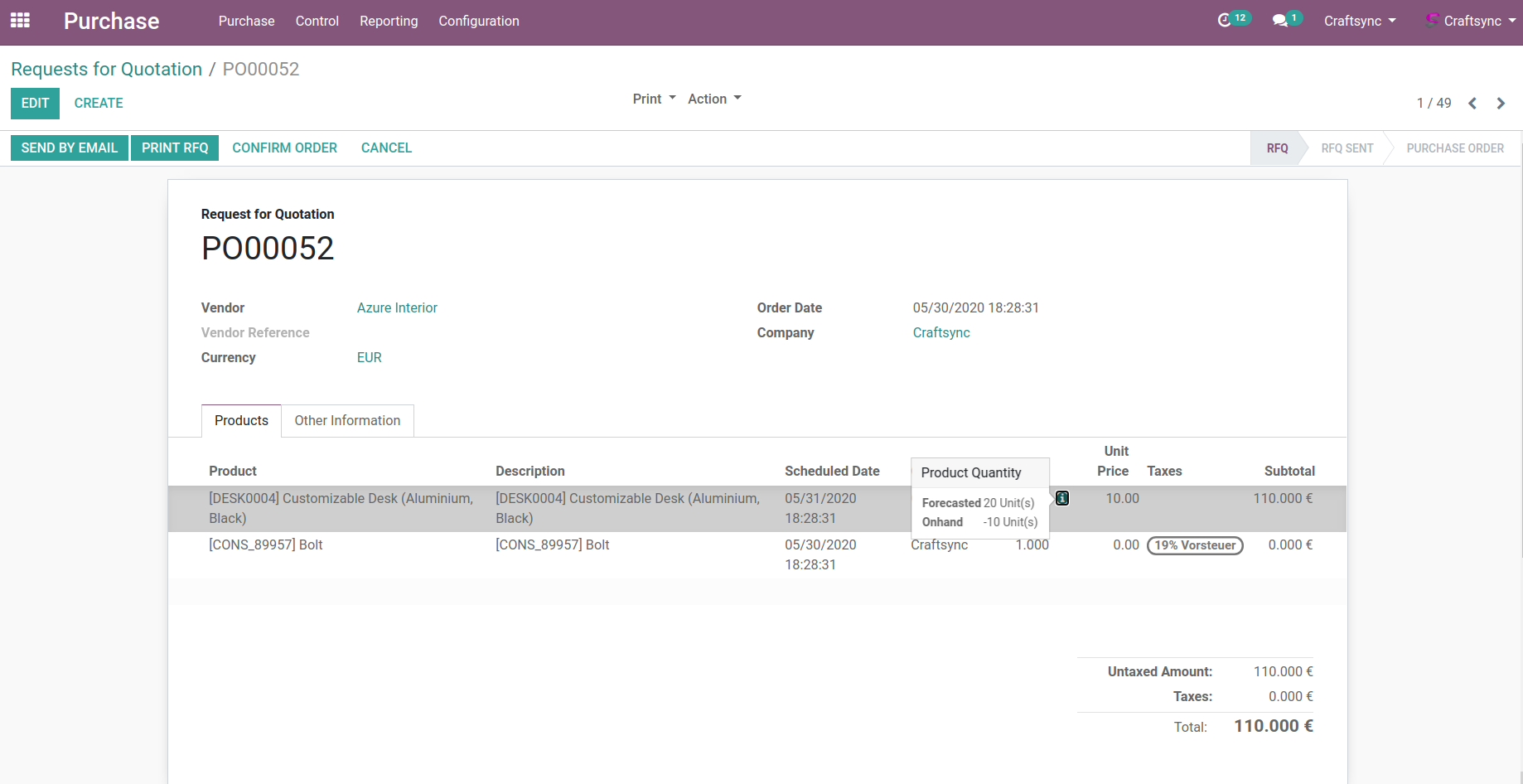 • User can easily see the product stock situation as below image. It will show link to popup only for stockable products. Link can be Red if stock less then ordered quantity in selected warehouse and Blue if stock is sufficient.