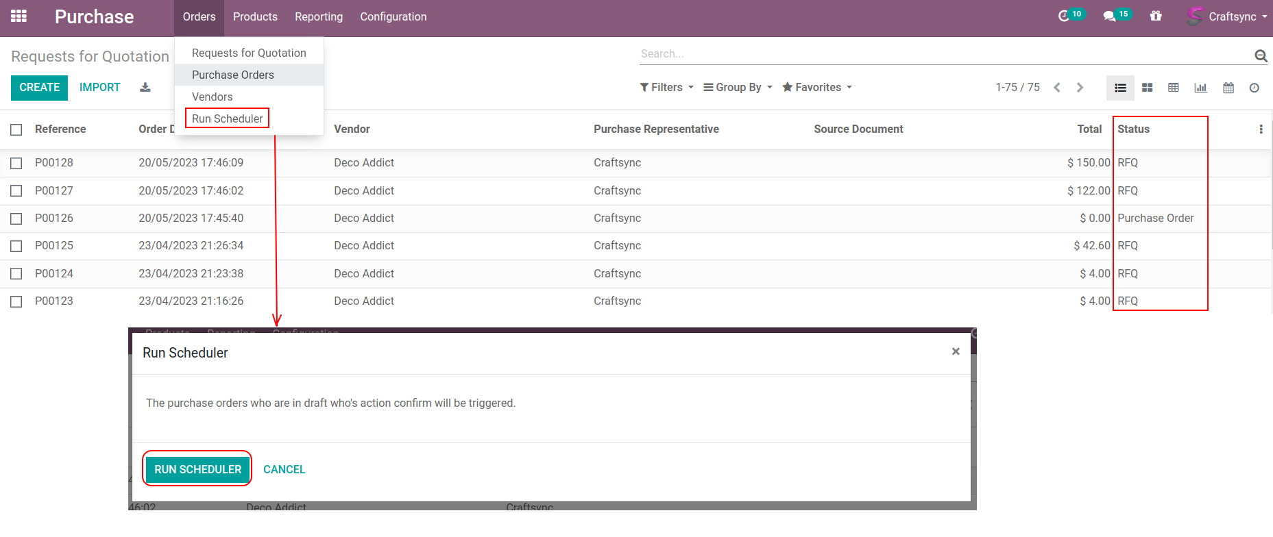 purchases orders list view after the scheduler run. Recently scheduler process this purchase order. And stage of this order was move to purchase order state from draft.