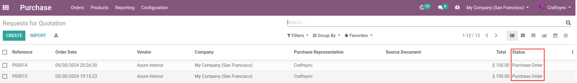 Here are Purchase orders whoes having office lamp as a product, PO list view having Two PO are in locked and Purchases order state.