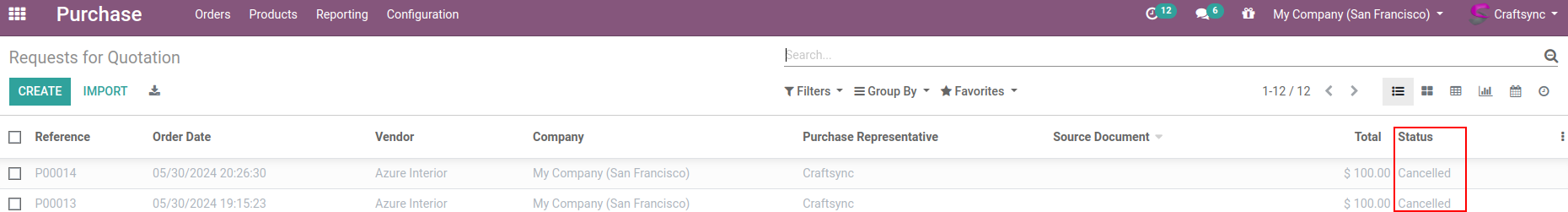 List view of Purchase orders. After clicking cancel PO button below order are now in cancelled state.