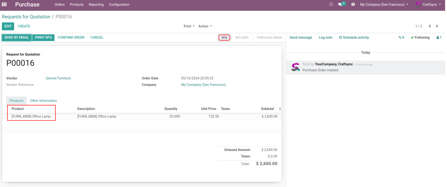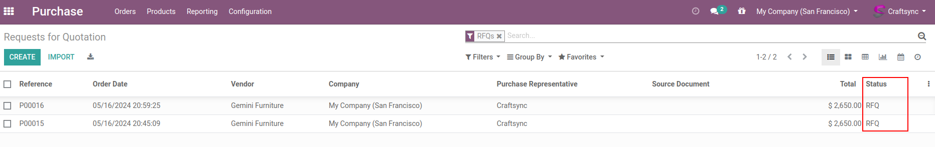 Here is Purchase orders whoes having office lamp as a product, PO list view having Two PO is in RFQ state.