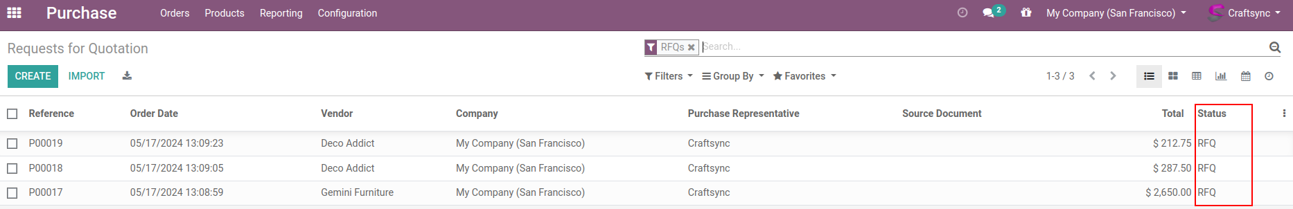 Here are Purchase orders list view, having three POs are in RFQ state.