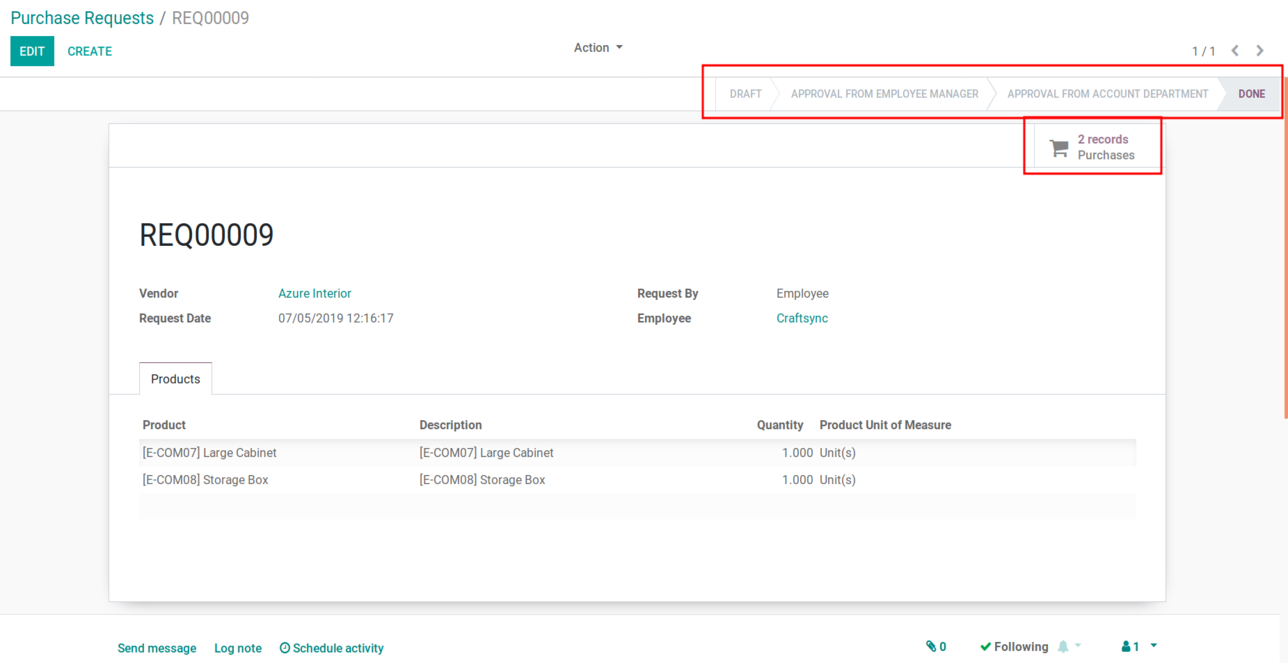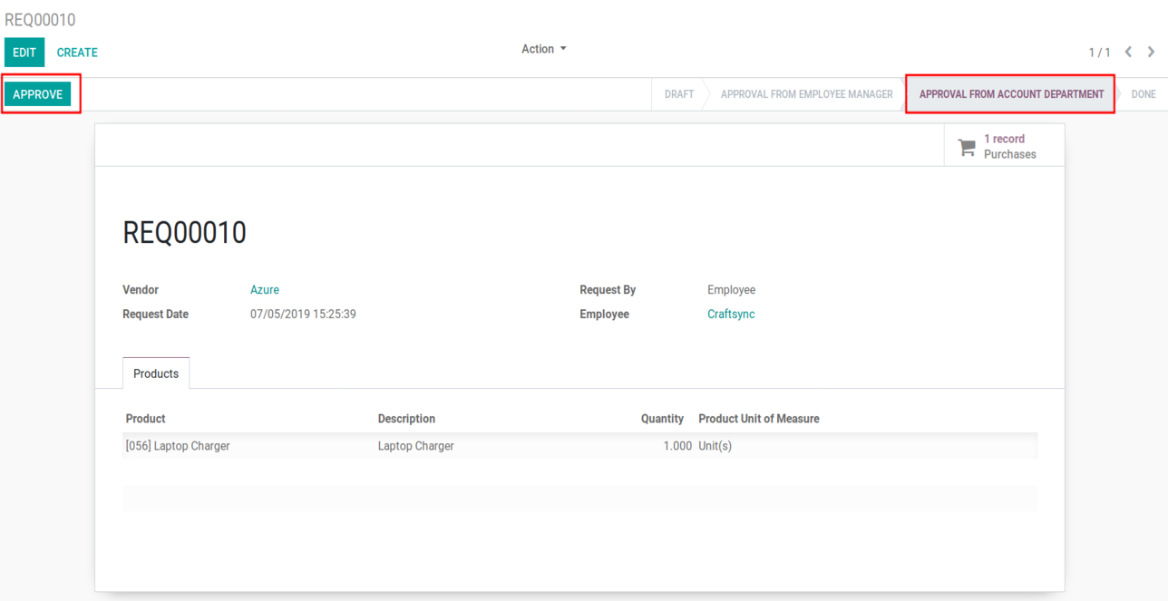 Above Image is of request by user or employee and stages that user have configured and vendor and product isn't require if user have not idea of that. And based on next stage configuration stage will change on approve button click.
