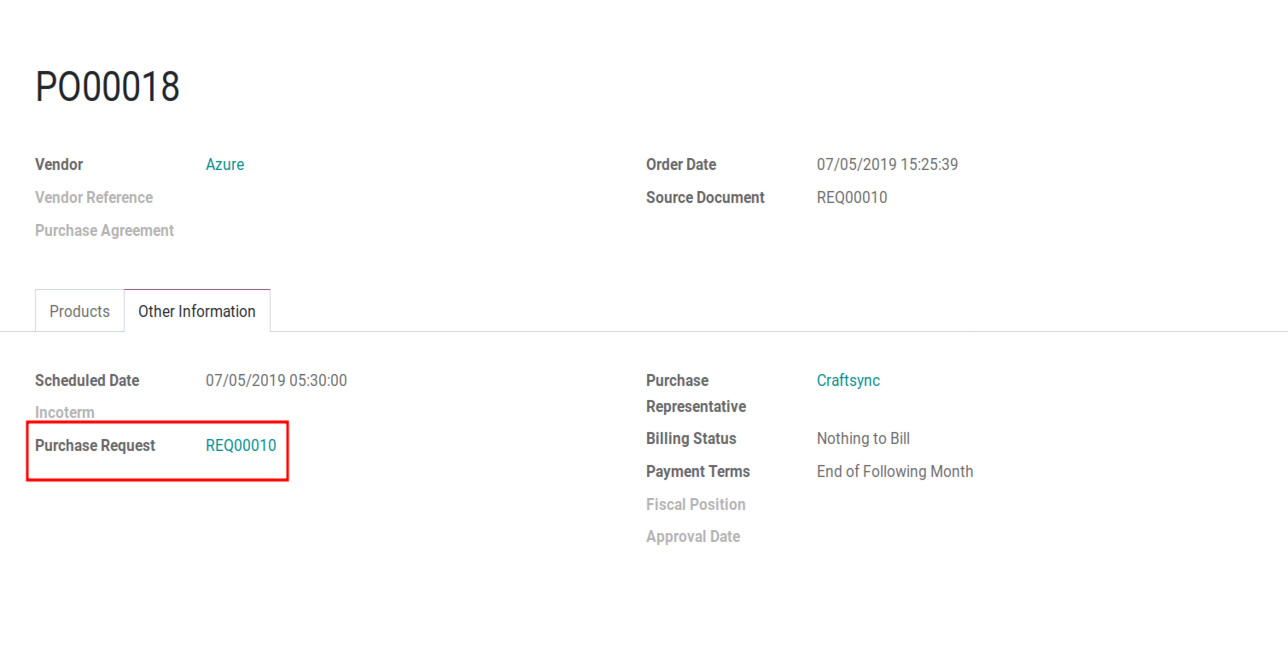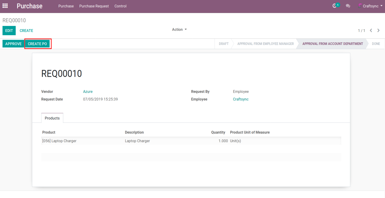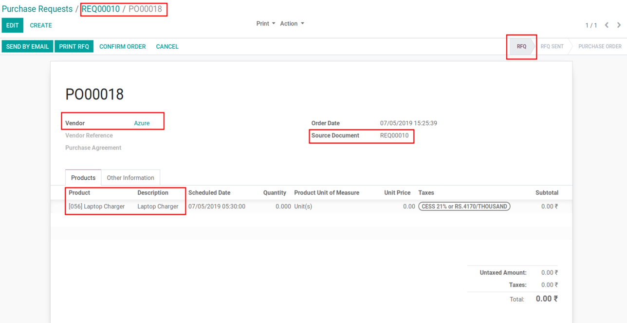 Create PO require vendor and product based on that Draft RFQ will generate and redirect to that view.
