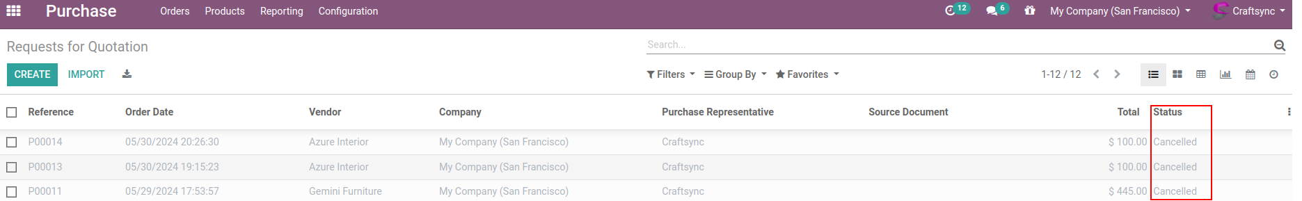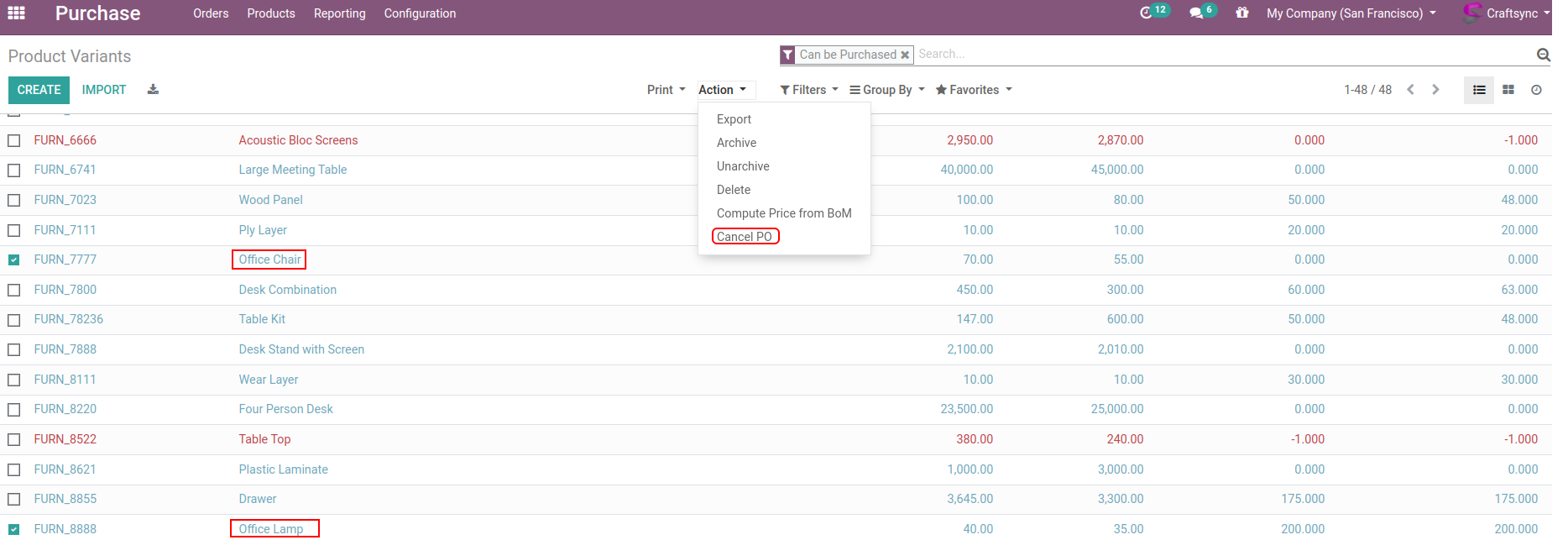 Products list view having Cancel PO Action.