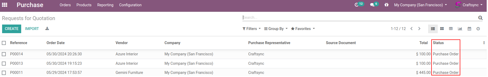 Here are Purchase orders list view, whose having Office Lamp and Office Chair as product. PO are in Purchases order state.