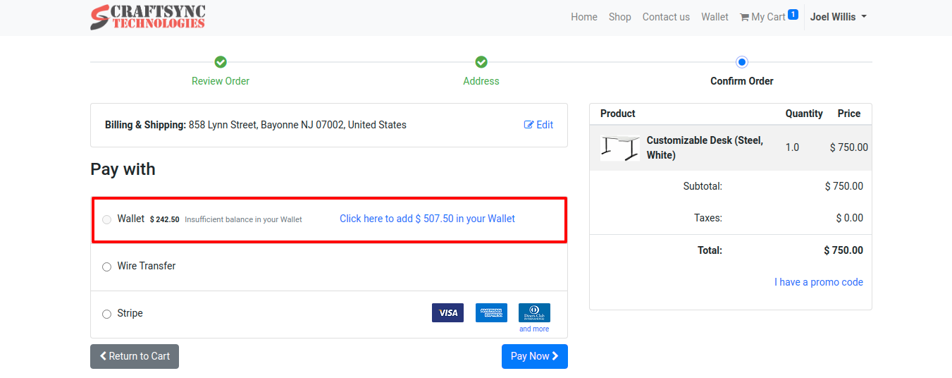 • In this order, order amount is $ 750 and wallet amount is $ 242.5. So this wallet amount is insufficient to pay for this order